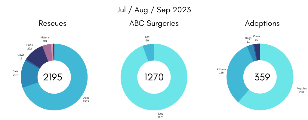 The rescues, birth control surgeries and re-homing by the Blue Cross Of India during the quarter (Jul-Aug-Sep 2023)