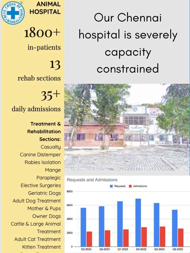 This project involves the construction of a new animal hospital block in Guindy, which will serve to increase our in-patient capacity and provide additional space for our expanding diagnostics laboratory. The estimated cost of this undertaking is Rs 1.3 crores, roughly equivalent to 156,000 USD. Your contributions will play a vital role in helping us commemorate our 60th year in a truly grand and impactful manner.
