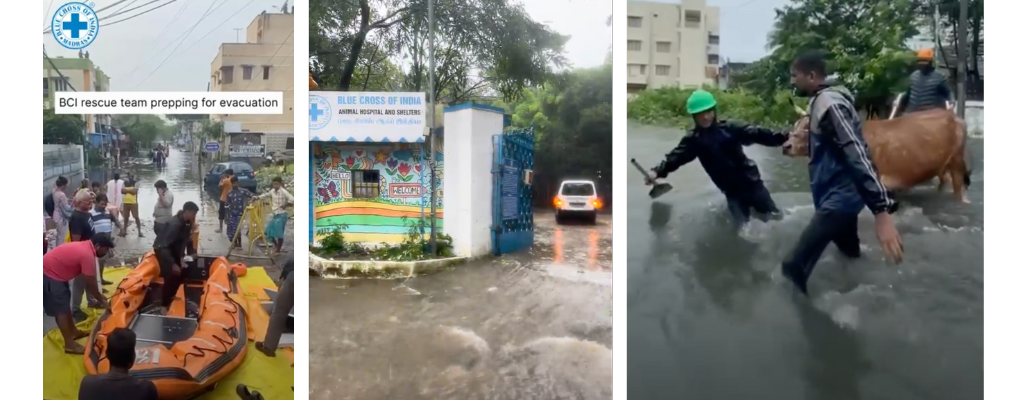 Despite facing adversity, we also triumphed over the impact of Cyclone Michaung in our own sanctuary in Guindy. The cyclone brought devastating floods, challenging the very fabric of our shelter. On the day of the flood, our vets, animal caregivers, and volunteers rallied together, displaying unparalleled heroism. With unwavering determination, they carried every single animal to higher ground, ensuring their safety amidst the rising waters.