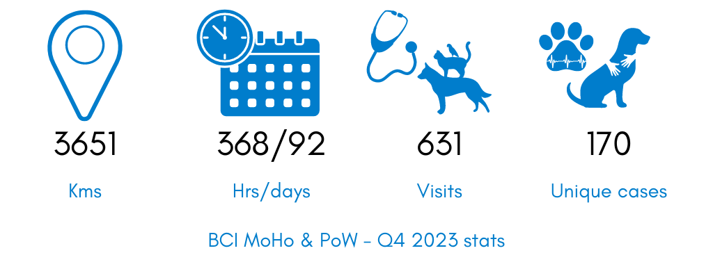 Our dedicated veterinarians, operating from our mobile units known as “MoHo’s,” consistently delivered primary diagnosis and initial treatment services. Acknowledging veterinary capacity constraints, we aimed to enhance operational efficiency, minimize response times, and reduce waiting periods between follow-up visits using the “PoW” 2-wheeler follow-up units. Despite the challenges, these units worked diligently this quarter to provide essential care.